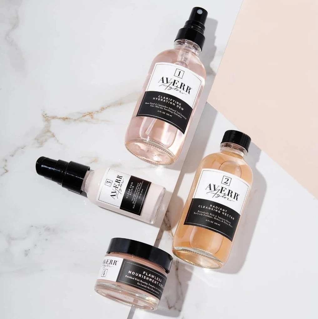 Averr Aglow vende cuidado de la piel dirigido a mujeres con acné, y los productos se venden individualmente y en kits. El más completo es el Averr Aglow Bundle, que se concentra en brotes, puntos negros y imperfecciones. Incluye rocío de hidratación clarificante, elixir de piel clara, tóner de tez luminosa, néctar de limpieza radiante, suero perfeccionista durante la noche, máscara exfoliante de esencia iluminadora, crema nutritiva sin defectos y desmaquillante Clear Gelée.